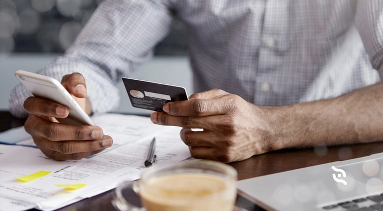 Um homem sentado em uma mesa, segurando um cartão na mão e um notebook aberto à sua frente, enquanto realiza um pagamento online.