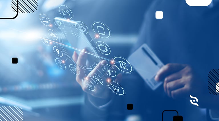 Mão segurando celular com artes relacionadas ao setor financeiro.